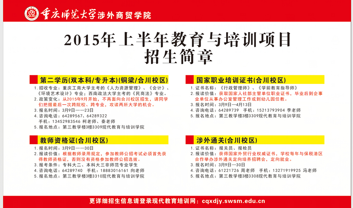 2.政策变化:从2015年9月开始,不在面向合川校区招生,请同学们把握最后一次跨院校、跨专业,攻读两所大学的机会。