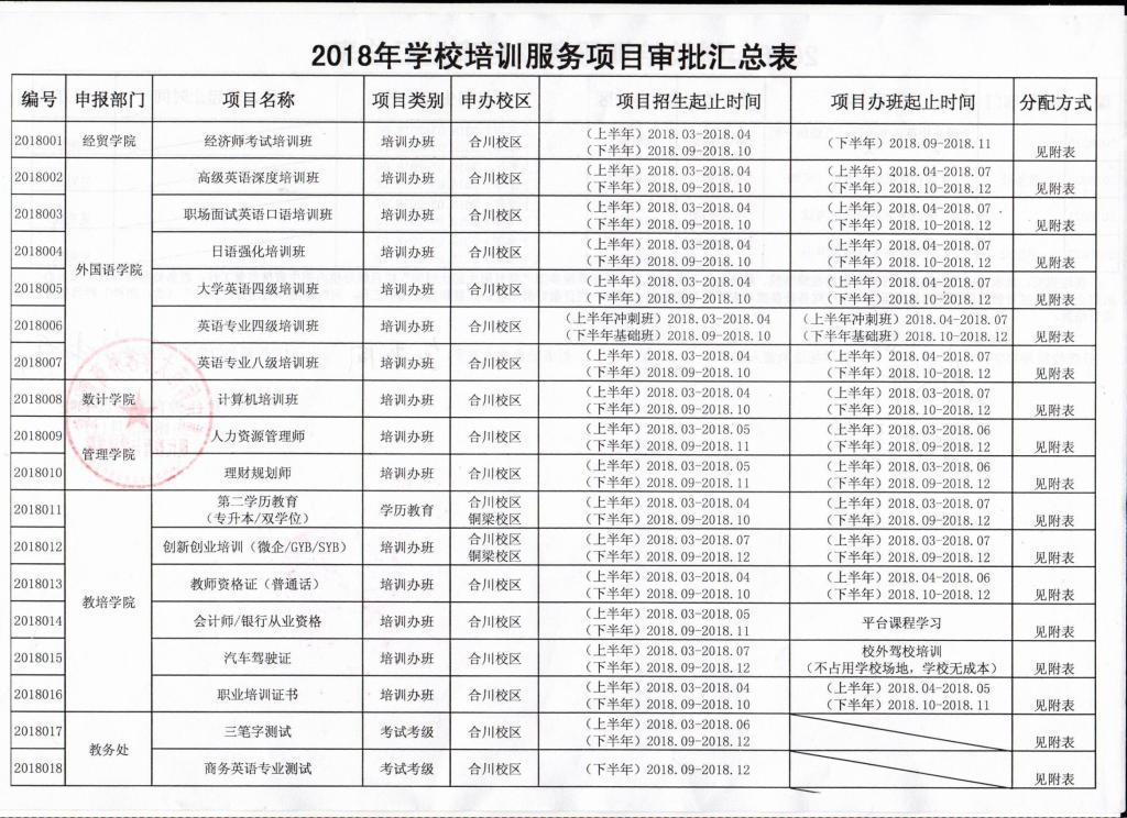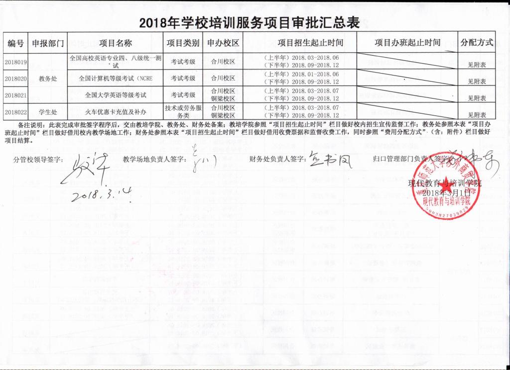 2018年全校各类培训服务项目现已经归口管理部门现代教育与培训学院会同财务处、教务处会审并报请党工委书记审批,于3月13日校长办公室会议校领导集体审定通过,现予正式立项公布。