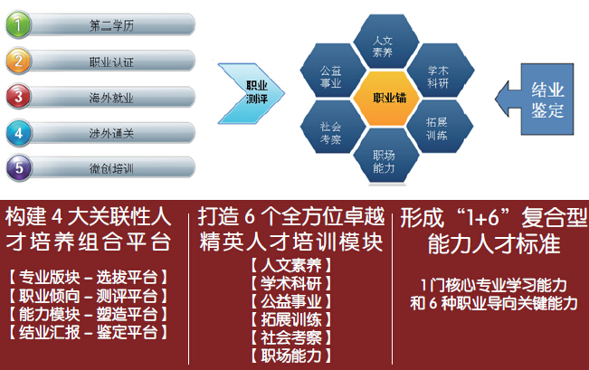 EYP 班学员以我院五大板块学员和学生会成员构成,首先对所有学员进行职业测评,明晰自我职业方向,组成由我院四位年轻老师为导师的四个竞技小组,以“职业锚”为中心,围绕人文素养、学术科研、公益事业、拓展训练、社会考察、职场能力等6 个“关键能力”进行培养,通过全方位、多层次的培养体系,完善具体实施方案,在下学期落实相关理论学习、实践活动和考核结业等工作,最终全面提高学员综合素质,成为真正的卓越应用型人才。